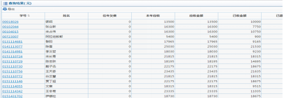 当前位置: 财务首页 > 业务指南 > 正文 查询学生欠费情况说明2021-03-05 文字: 1.打开内蒙古大学主页——点击“组织机构”——点击“财务处”——点击右上角“综合信息门户”(初始用户名及密码均为职工号)。 或直接登录内蒙古大学财务处网址:http://183.175.46.4/WFManager/login.jsp 2.点击左侧:“新版财务查询” 3.点击我的“收费查询”——“学生缴费明细查询” 4.查询功能选择“欠费查询”,点击“按条件高级查询”,出现如下界面: 在右上角选择学院后,点击左下角的“查询”,点击“导出”可将查询结果导出。 下一篇:网上报销操作演示视频
